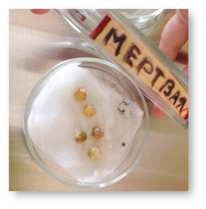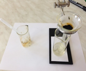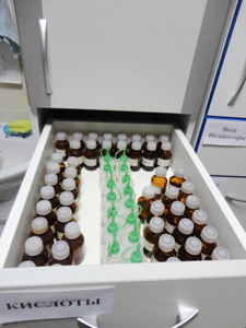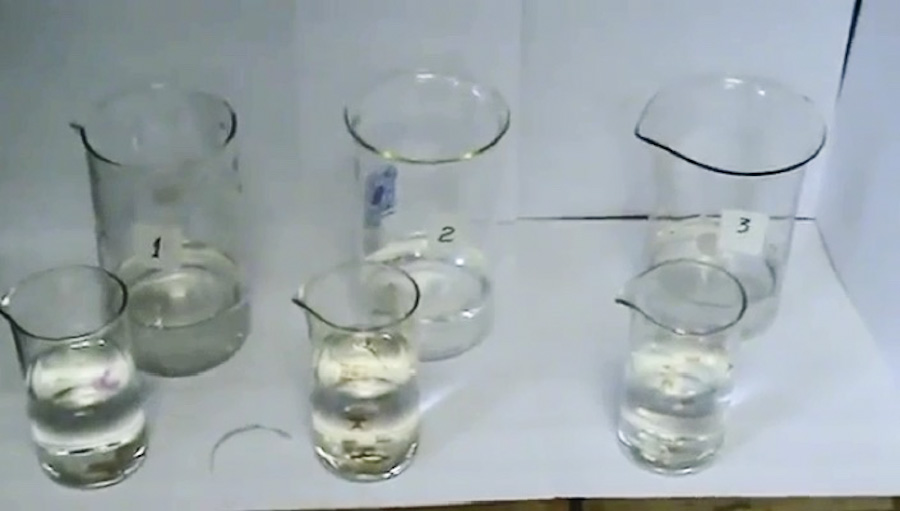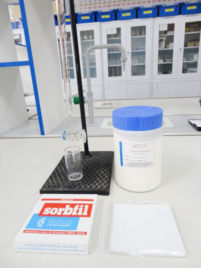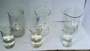 В маленьких стаканах находится по 100 мл рабочего раствора Сульфита натрия, серной кислоты, крахмального клейстера