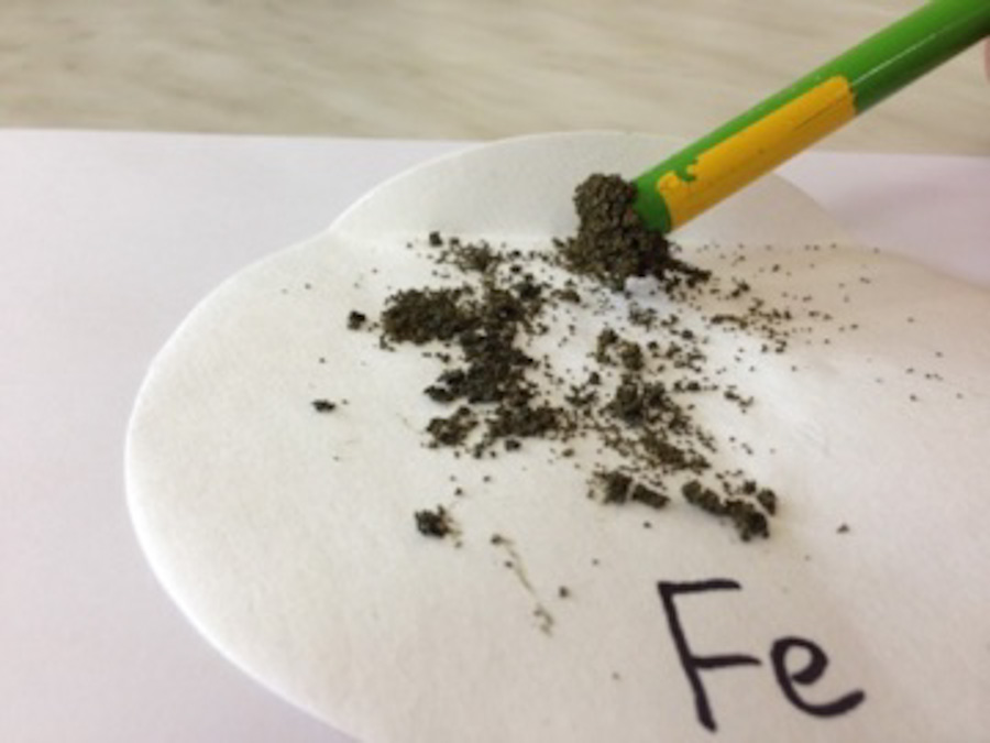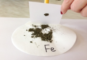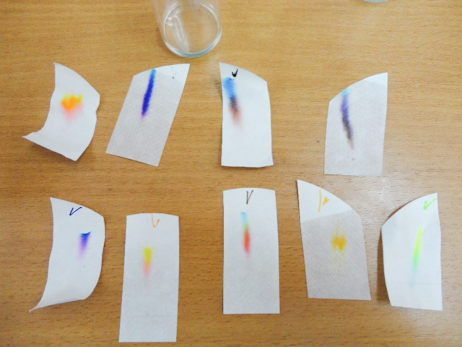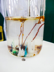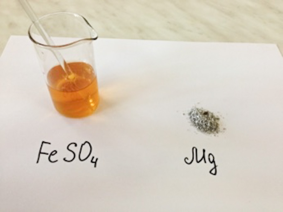 Химик-фокусник ставит 6 стаканов с одинаковыми объёмами бесцветных растворов. Добавив в первый стакан также бесцветного раствора из колбы, он получает раствор тёмно-синего цвета. Зрителям предлагается проделать то же самое, используя оставшиеся стаканы. Однако при добавлении содержимого колбы растворы во всех пяти стаканах остаются бесцветными! Затем фокусник приказывает растворам окраситься и растворы окрашиваются один за другим строго по его команде. Повторите «фокус» и объясните его.